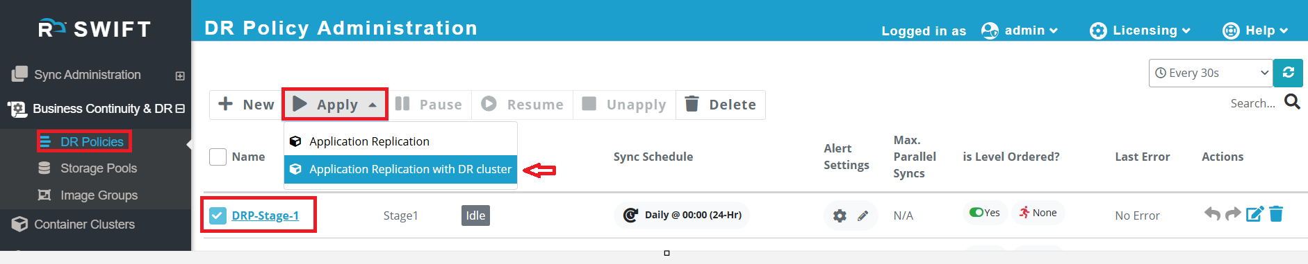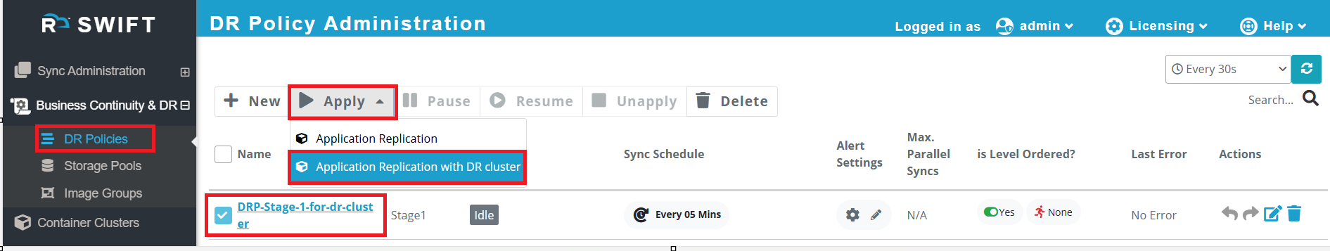 1. Go to DR Policies under Business DR and Continuity > click on the created Stage1 DR Policy > then click on the Apply button > choose Application Replication with DR Cluster.