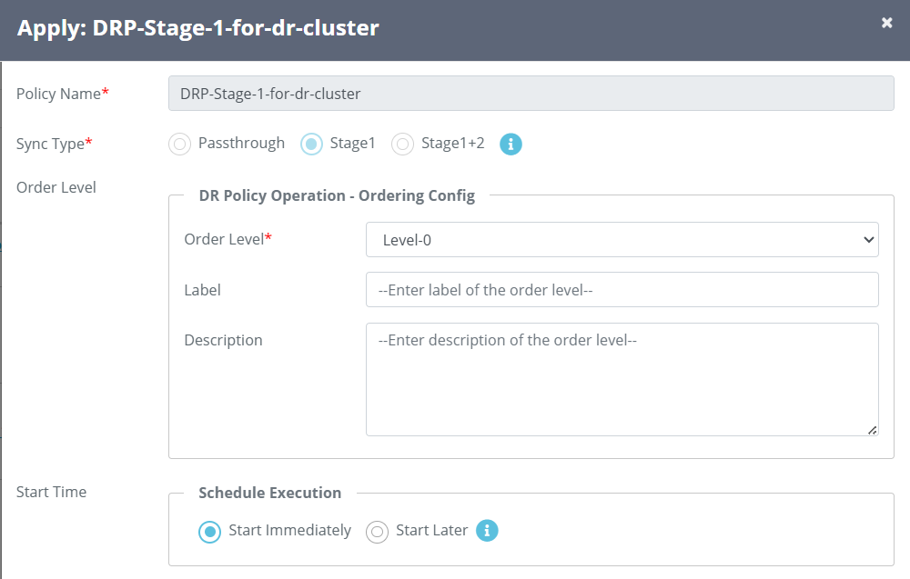 1. Click on created stage1 DR Policy > Click on Apply > Select 'Application replication with DR cluster'.