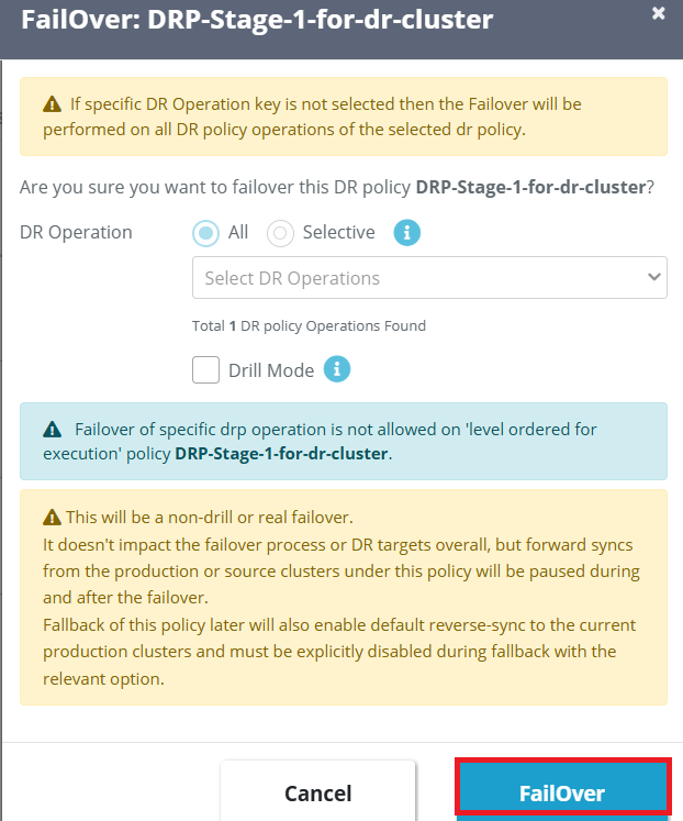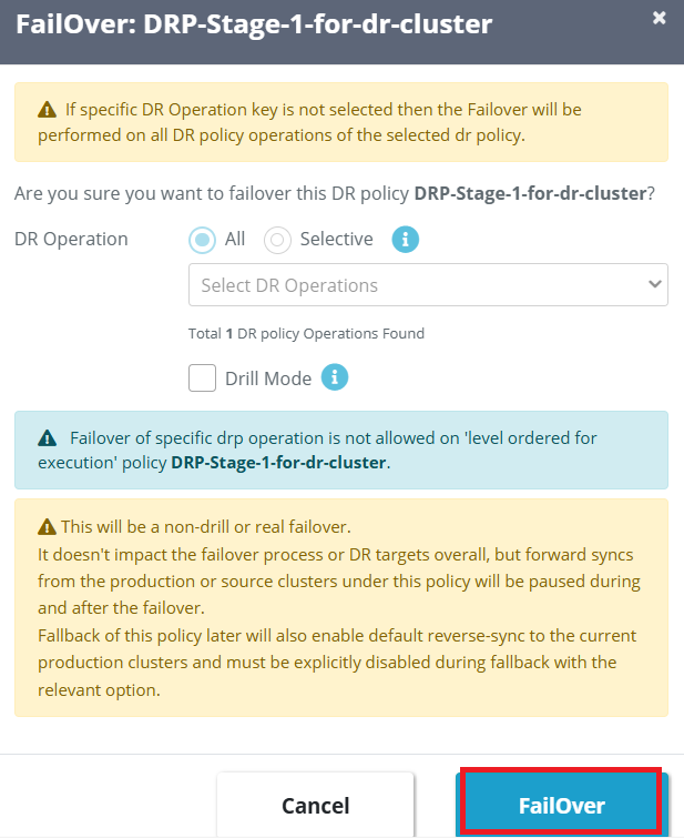 DR Drill = The drill failover will failover the policy by doing one forward sync end to end. The drill mode is assumed to be used for testing of your actual DR drills. In case of a real failover, the forward sync is done as a best attempt (though stage-2 syncs will always be performed if policy is staged sync type). The drill mode is marked with a special policy state.