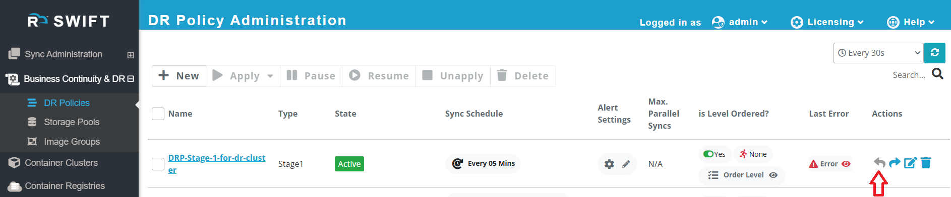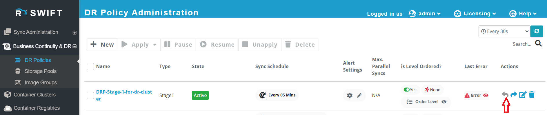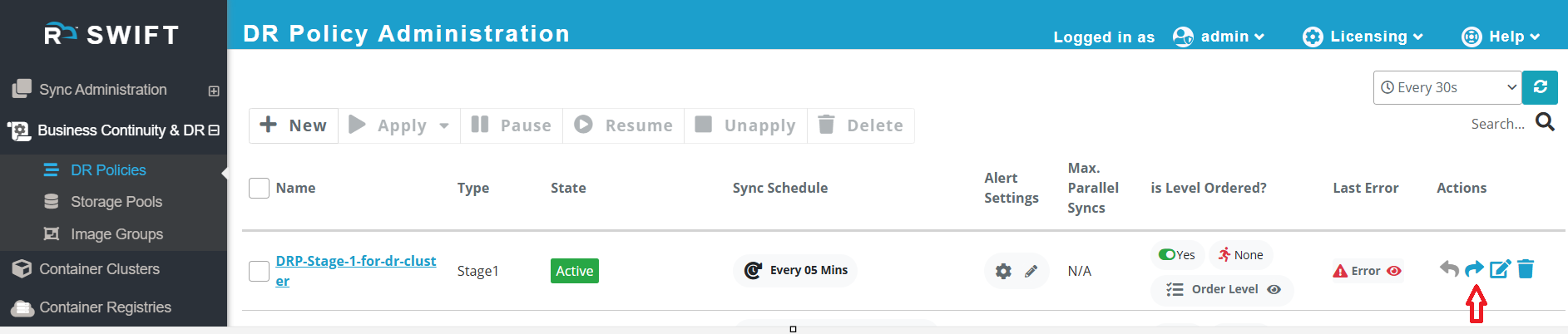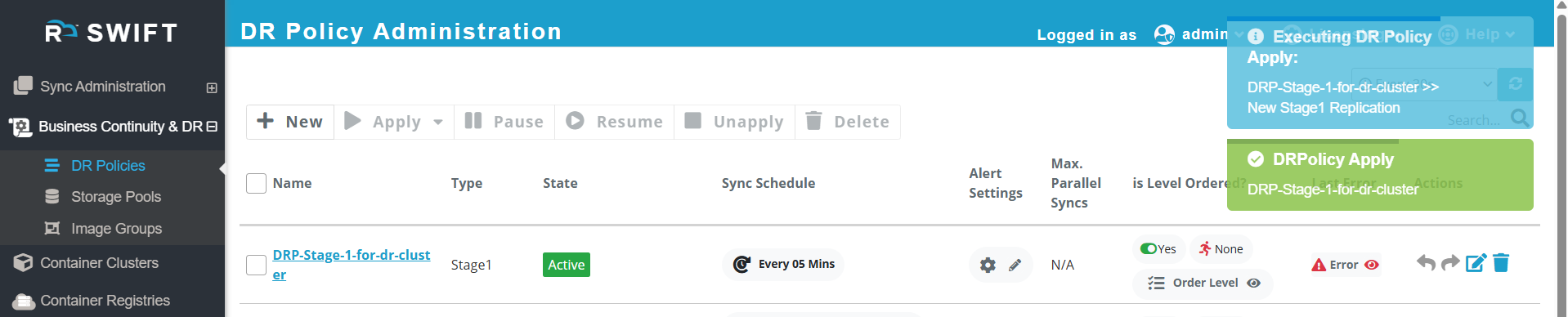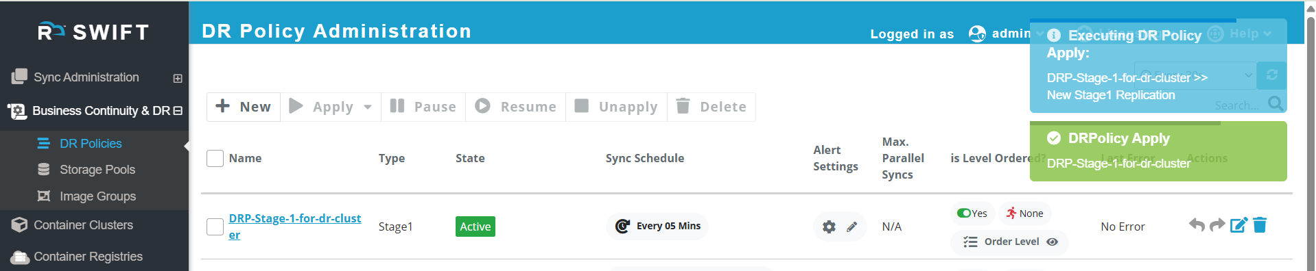 3. Once you click on 'Apply' button, then stage DR Policy will be in 'Active' state.