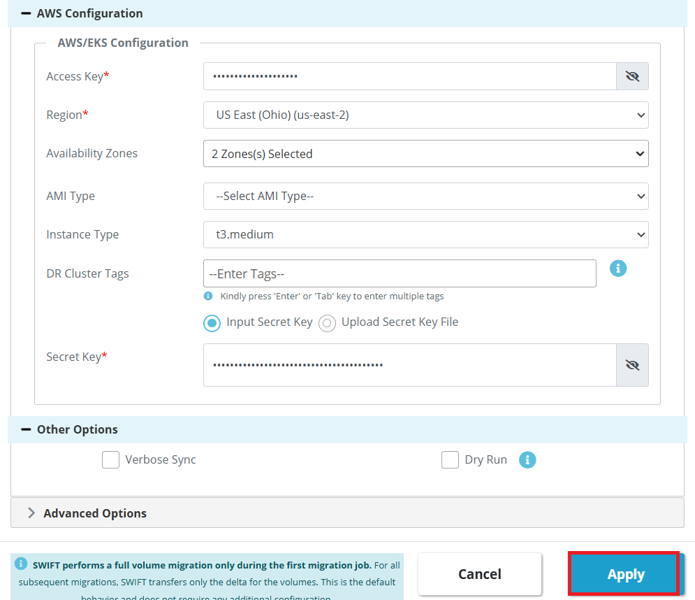 | Secret key | Provide the secret key as this is the private part of your AWS credentials, used along with the Access Key ID to authenticate SWIFT so it can securely create and manage DR resources in your AWS environment. |