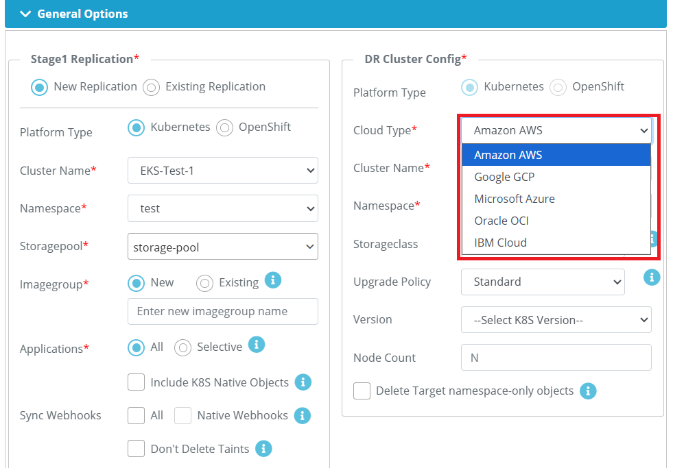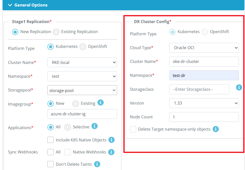 1. You can apply the Stage-1 DR policy with ‘Application Replication with DR Cluster’, then select the Oracle OCI cloud type from the dropdown and fill in the required information, similar to how it is done for GCP.