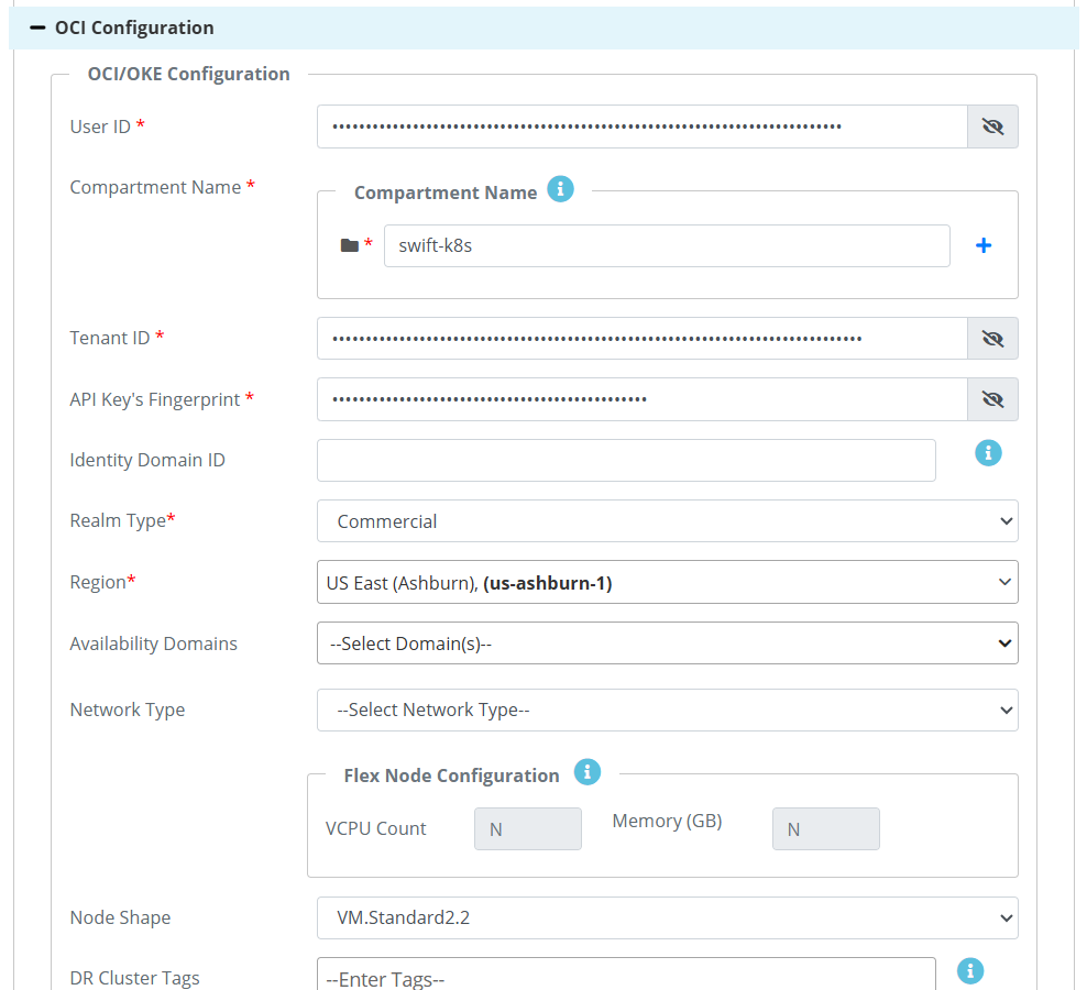 | DR Cluster Tag | Add tag to organize your resources. For more information, you can click on 'i' button on SWIFT dashboard. |