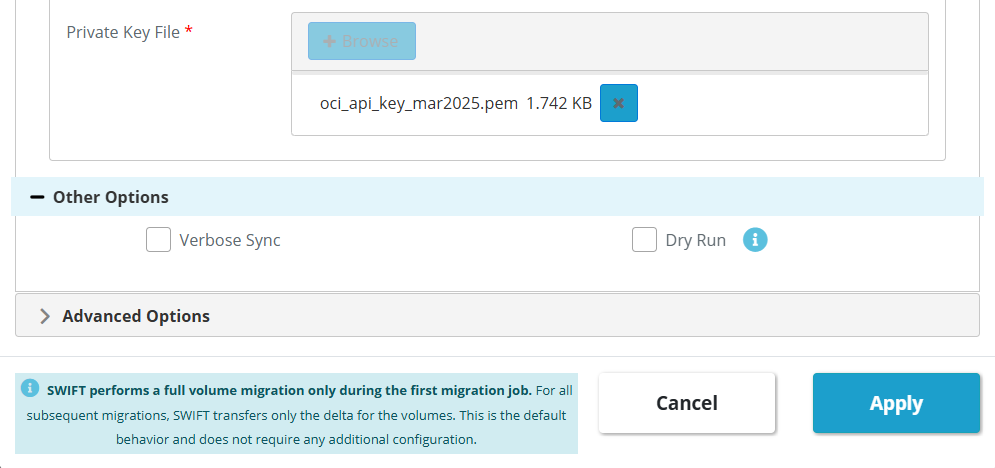 | Private key file | Provide private key file, The Private Key File corresponds to the API key you generated for OCI authentication. It’s used by SWIFT to securely sign API requests to OCI. |