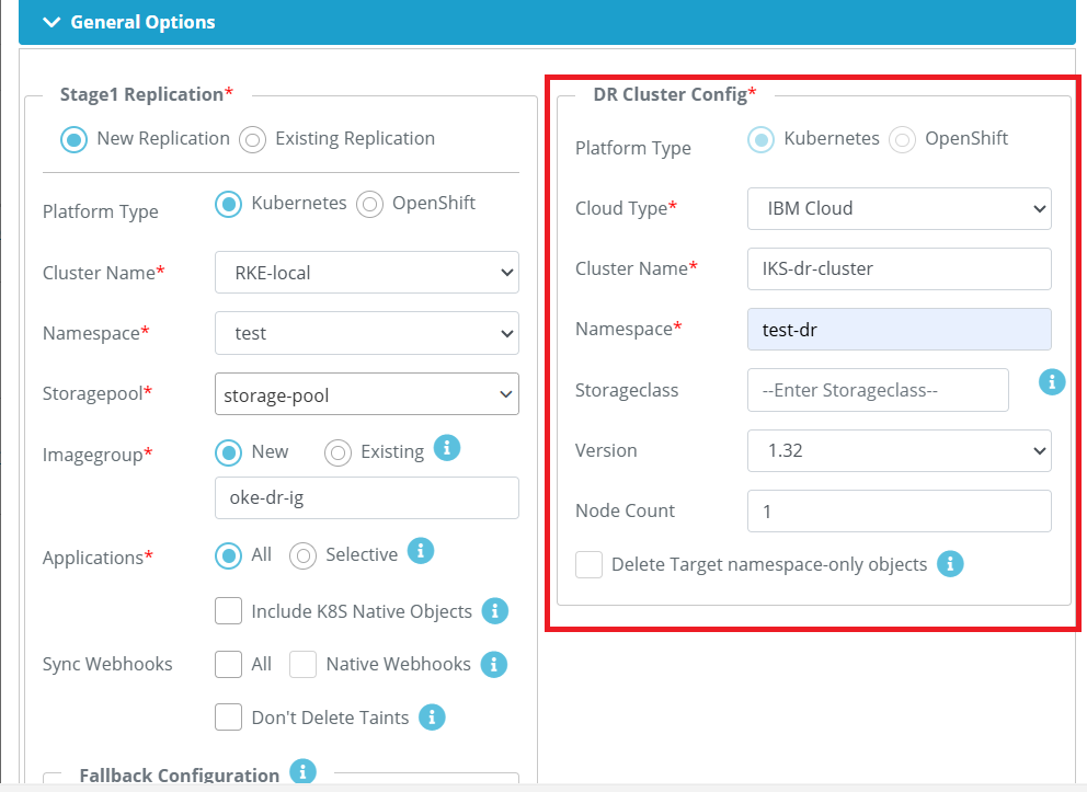1. You can apply the Stage-1 DR policy with ‘Application Replication with DR Cluster’, then select the IBM cloud type from the dropdown and fill in the required information, similar to how it is done for GCP