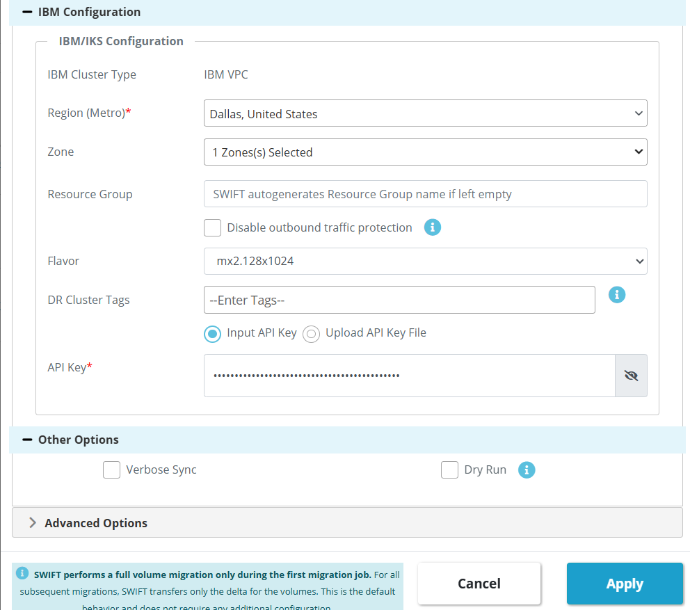 | API Key | Provide the API key as IBM Cloud API Key is a secure credential that allows tools like SWIFT to authenticate and perform operations on your behalf (create, manage, or delete DR clusters). |
