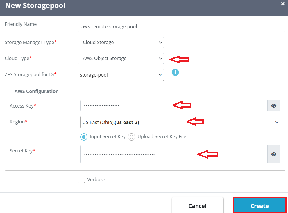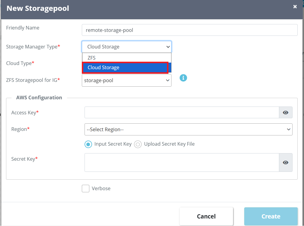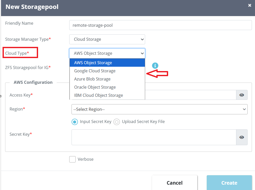 1. To create a AWS remote storage pool. Please refer 'Create remote storage pool' section and select the AWS Object storage in 'Cloud Type' section. Once you click on AWS Object Storage, the new window will be appeared as below.