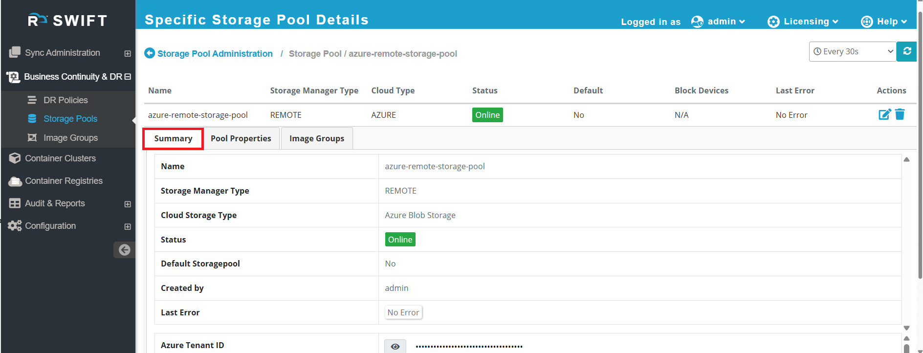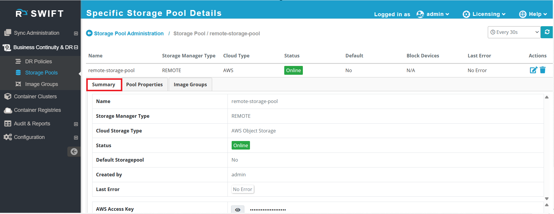3. When you click on it, you will see detailed insights of the remote storage pool. As shown in the screenshot below, it displays a summary that includes the storage manager type, AWS access key, secret key, and other related information.