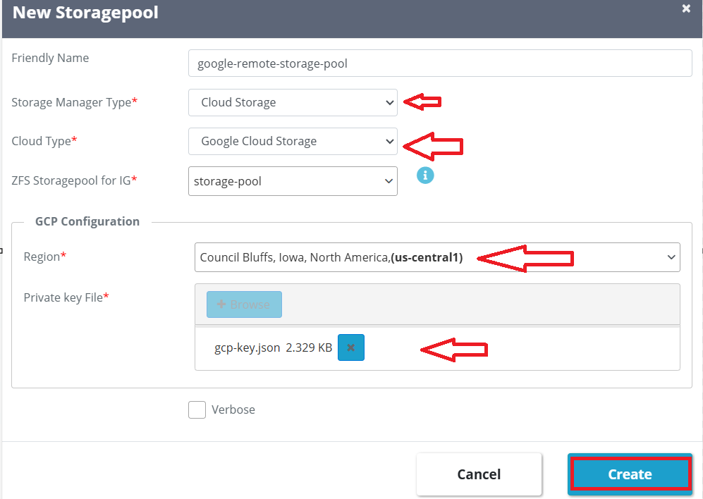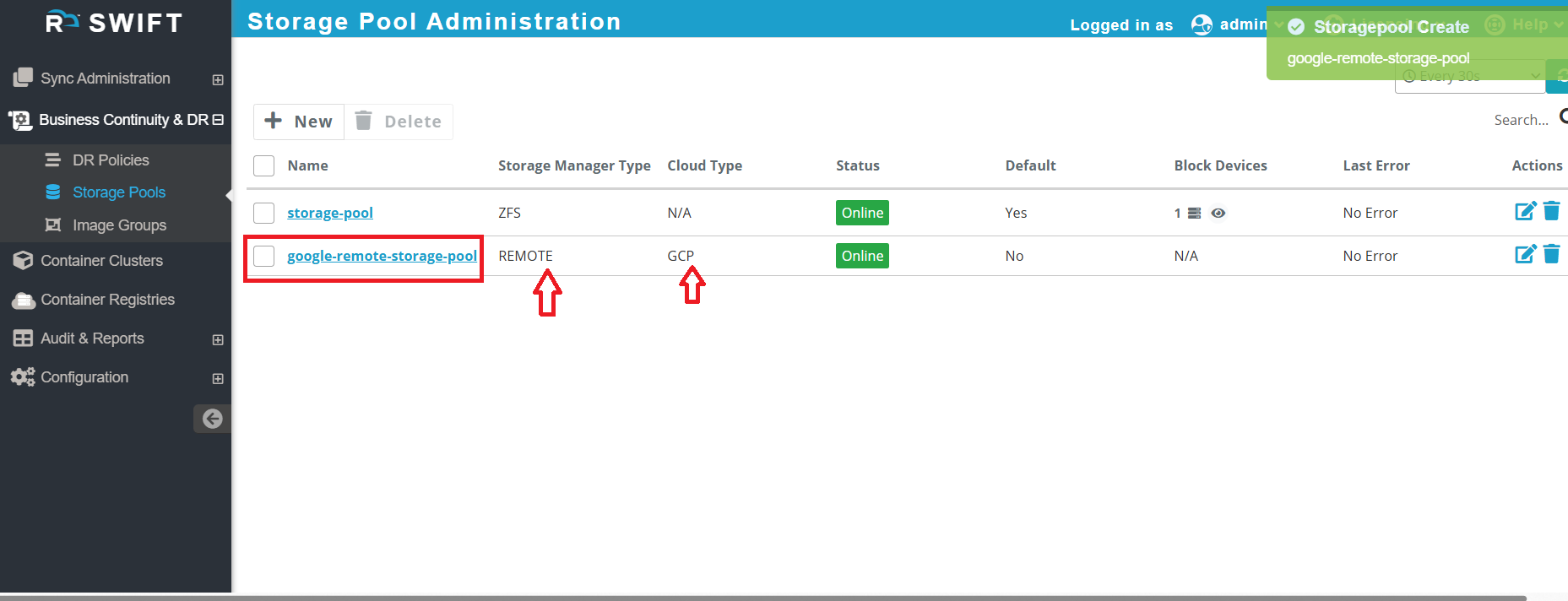 2. Once click on create button ,then Google Remote storage pool will be created.
