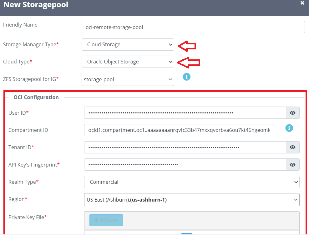 1. To create a OCI remote storage pool. Please refer 'Create remote storage pool' section and select the OCI Cloud storage in 'Cloud Type' section. Once you click on OCI cloud Storage, the new window will be appeared as below.