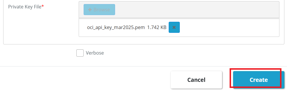 | Private key file | The private key (.pem) file that matches the public key uploaded to OCI. Know More |