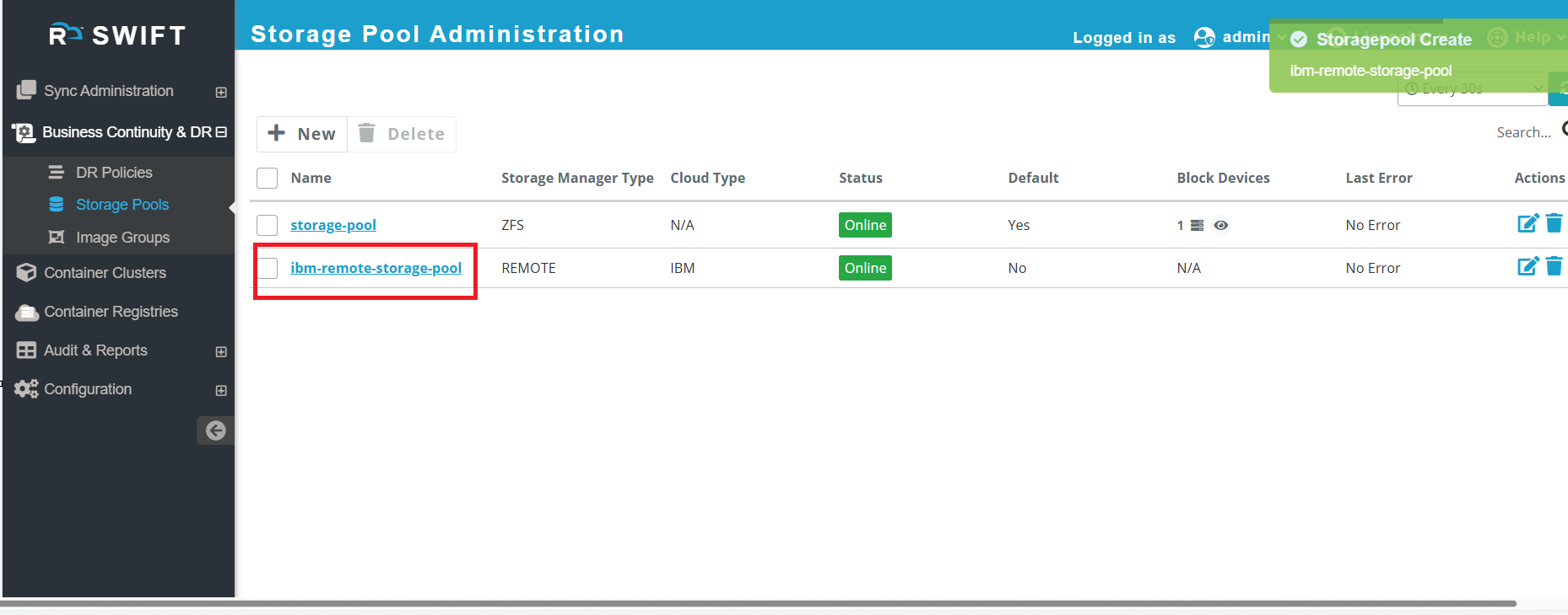 2. Once click on create button ,then IBM Remote storage pool will be created.