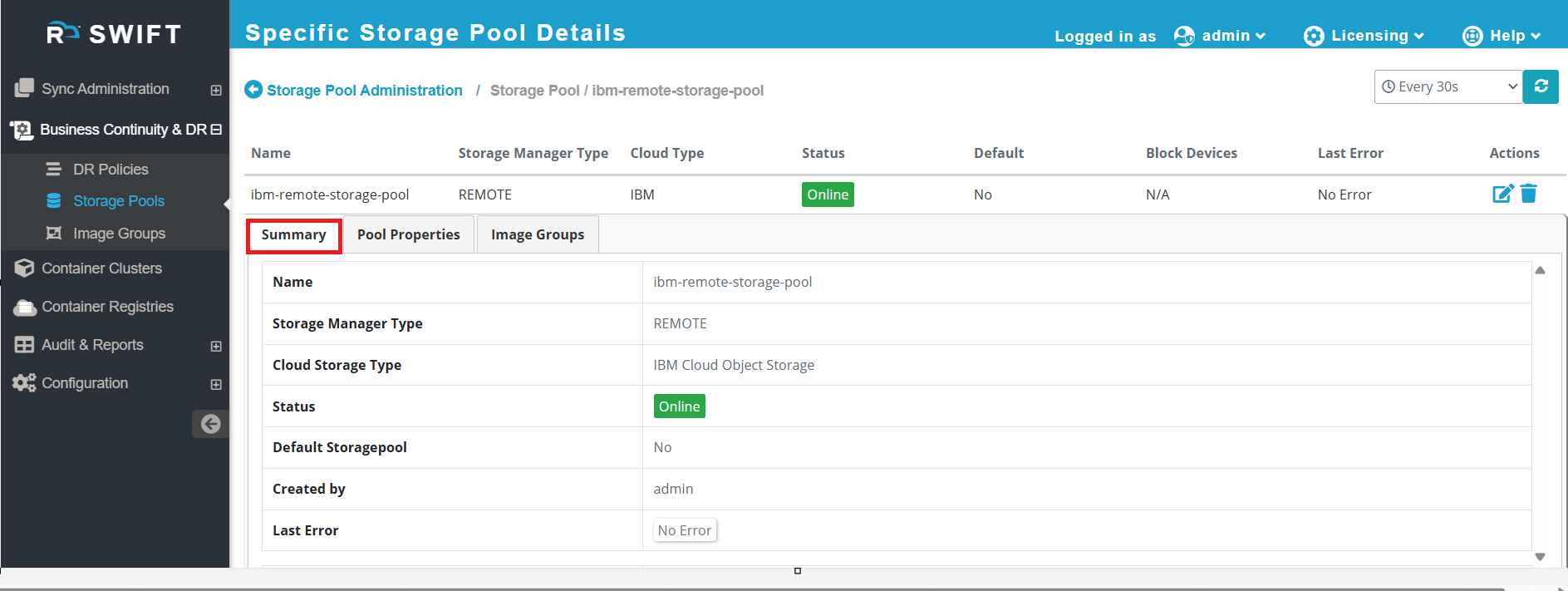 3. When you click on it, you will see detailed insights of the remote storage pool. As shown in the screenshot below, it displays a summary that includes the storage manager type, IBM object storage name, IBM region, API key and more.
