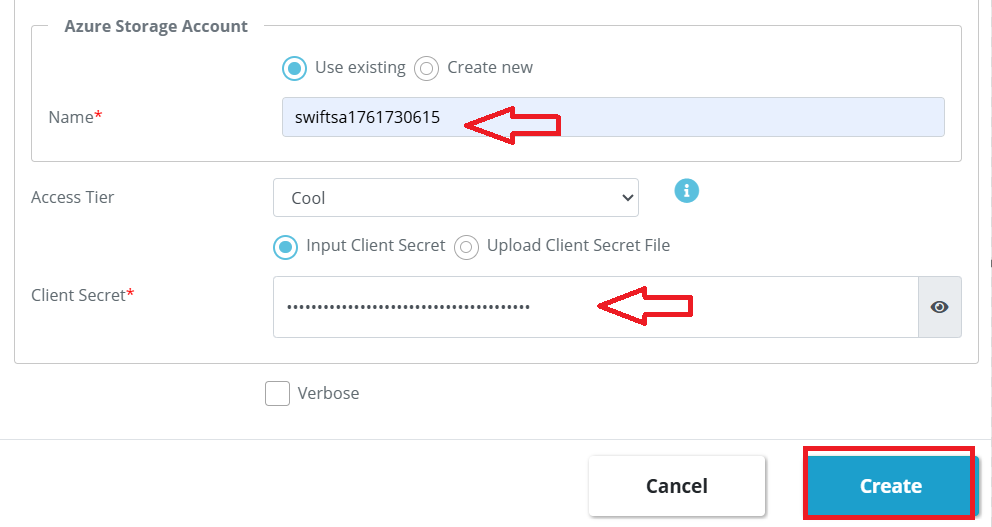 2. Required access credentials (e.g., Access Key, Secret Key, or Service Principal details).