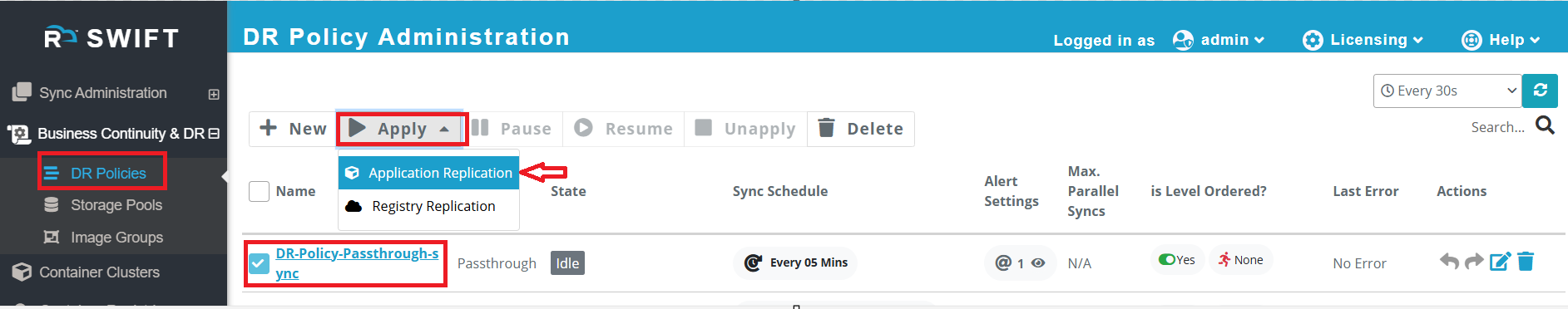 1. We first need to apply the Passthrough DR Policy. Go to DR Policies under Business Continuity & DR, click on the created Passthrough DR Policy, then click Apply, and select Application Replication.
