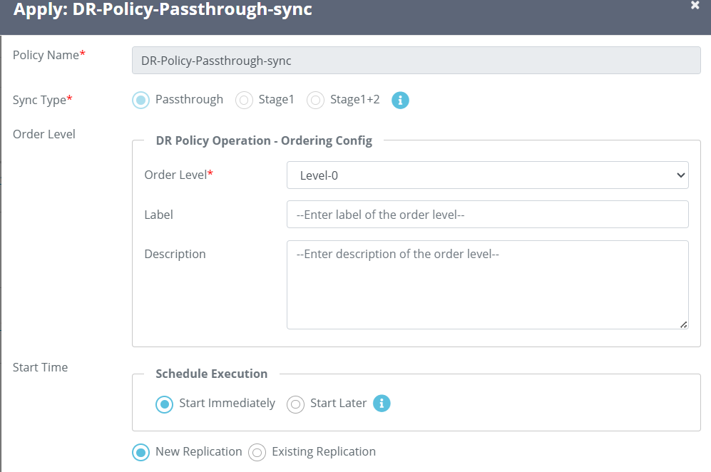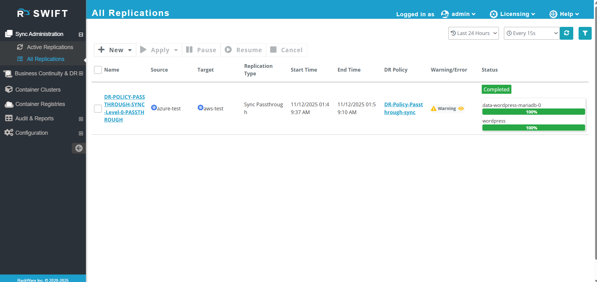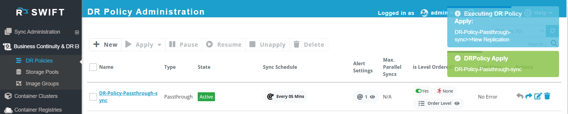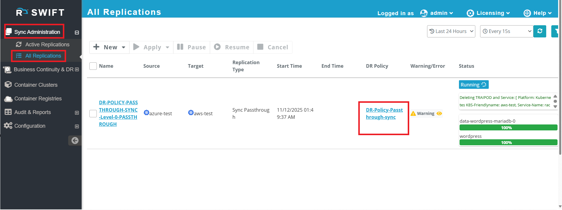 4.You can check the sync by navigating to Application Replication under Sync Administration. There, you will see the Passthrough sync started by the applied DR Policy. You can also view the DR Policy name. Refer to the screenshot below for reference.