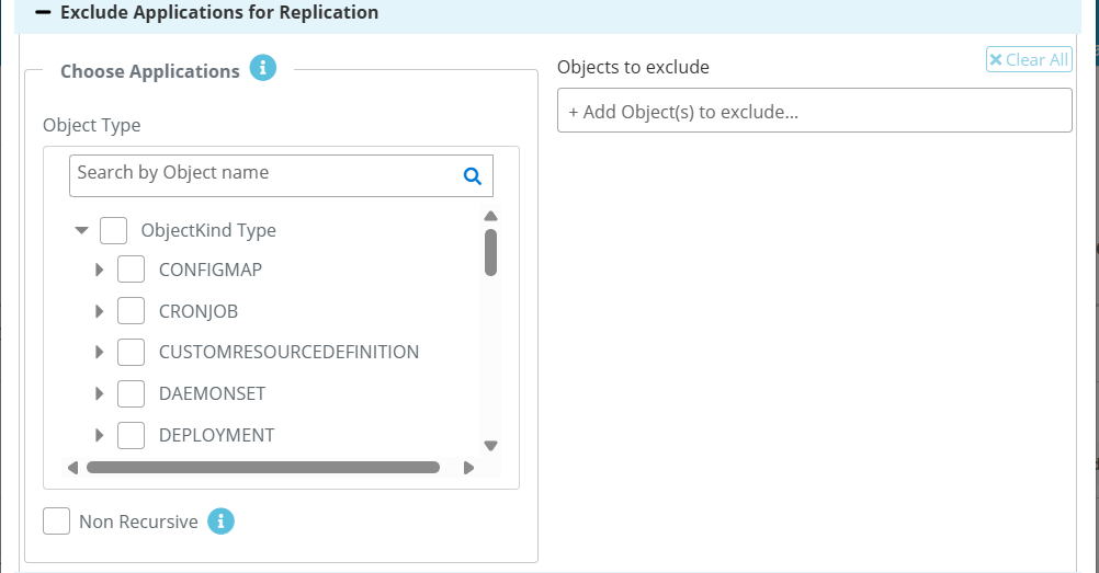 | Applications | All -> Everything in your IG, all objects will be replicated. Selective --> If you want to do only selected object then you can use this option. Include K8S native objects --> Include native k8s objects' ensures that Kubernetes objects like Services, ConfigMaps, Secrets, and Ingress are migrated along with the application |