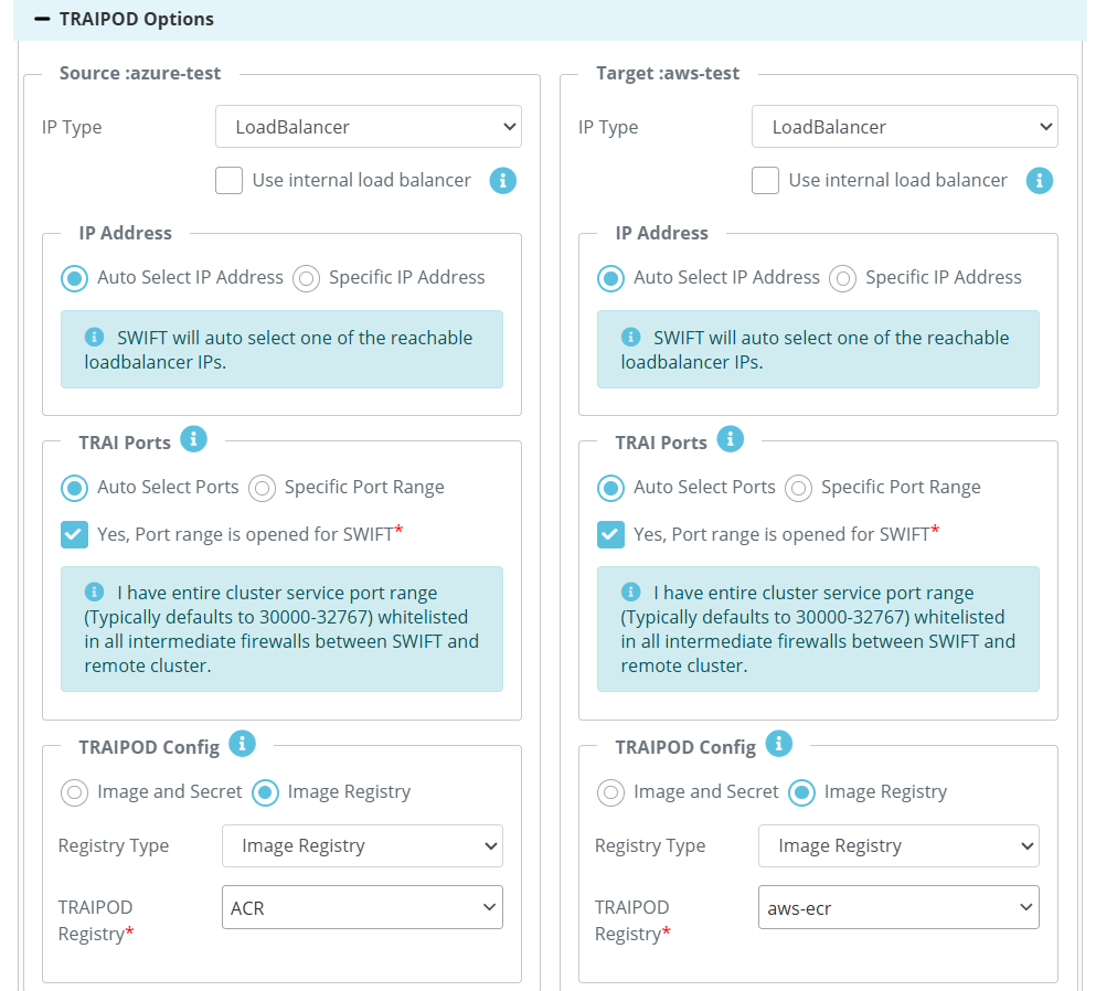 | Traipod Options | In the TRAIPDO section, you can choose either Auto-select Port or specify a Custom Port Range (if you have whitelisted ports between 30000–32767). The selected port will be opened in the cloud firewall accordingly. In the TRAIPDO Config section, you will see two options: 1. If you select 'Image and Secret', you will need to provide the image and its corresponding image secret at both sides. 2. If you select 'Image Registry', you can choose an image registry that has already been added to the container registry at the both sides. |