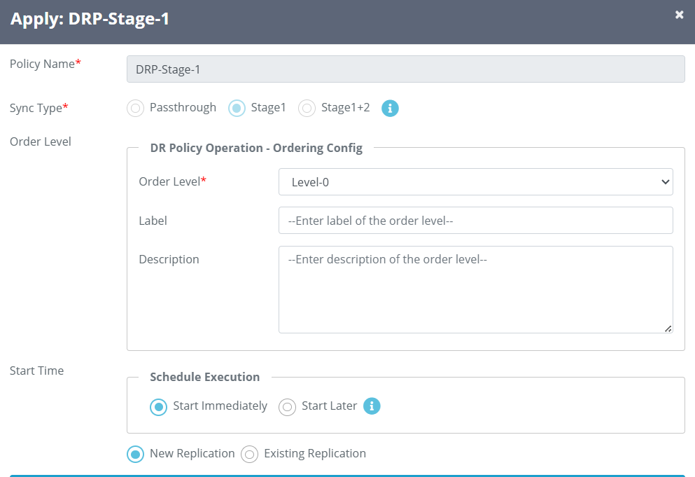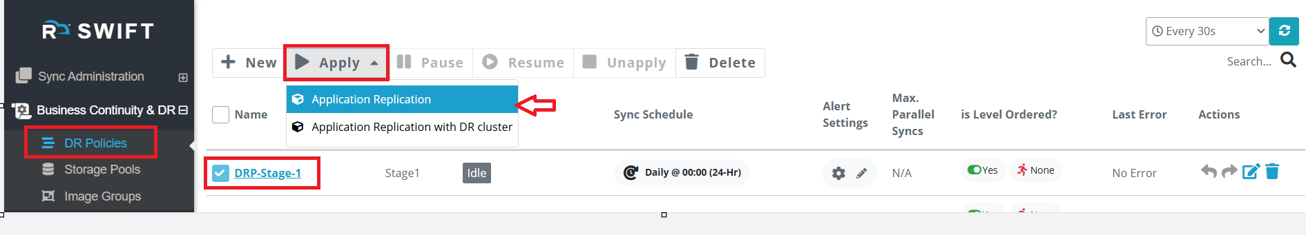 1. We first need to apply the Passthrough DR Policy. Go to DR Policies under Business Continuity & DR, click on the created stage-1 DR Policy, then click Apply, and select Application Replication.