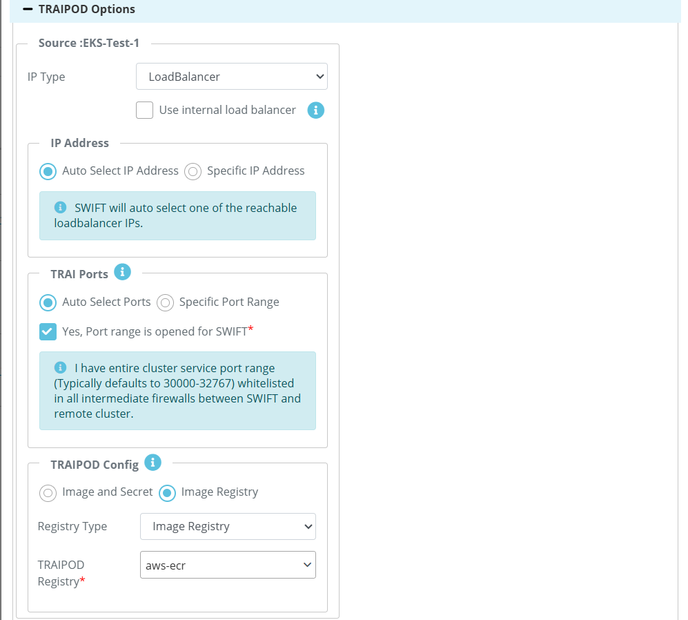 | Traipod Options | In the TRAIPDO section, you can choose either Auto-select Port or specify a Custom Port Range (if you have whitelisted ports between 30000–32767). The selected port will be opened in the cloud firewall accordingly. In the TRAIPDO Config section, you will see two options: 1. If you select 'Image and Secret', you will need to provide the image and its corresponding image secret at both sides. 2. If you select 'Image Registry', you can choose an image registry that has already been added to the container registry at the both sides. |