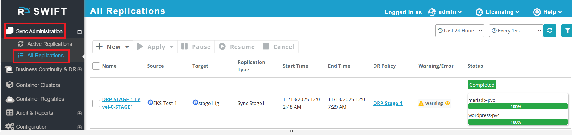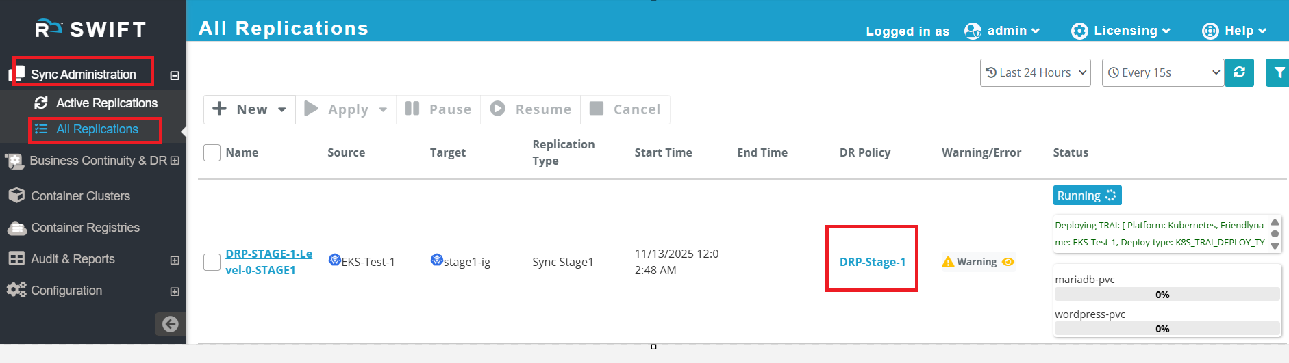 4. You can check the sync by navigating to Application Replication under Sync Administration. There, you will see the Sage-1 sync started by the applied DR Policy. You can also view the DR Policy name. Refer to the screenshot below for reference.