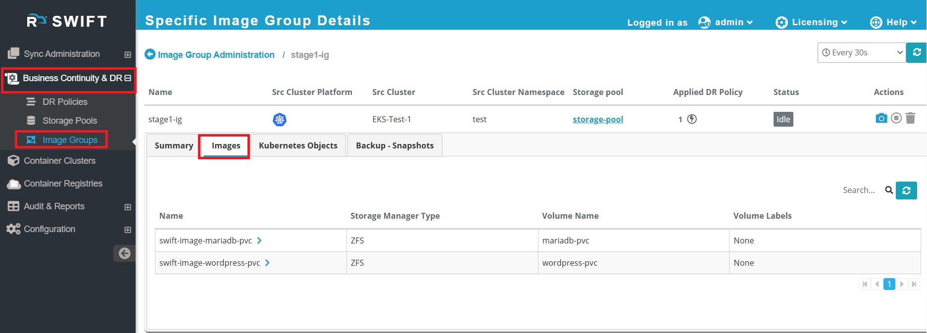 Stage 1 is used to back up your application data into SWIFT. It lets you sync your source cluster with SWIFT without running a DR cluster, helping optimize costs. During this sync, all selected cluster volumes are captured and stored as images in the SWIFT database for backup and recovery. When a DR Policy is applied, the backup process is automated and runs on a scheduled basis within SWIFT.