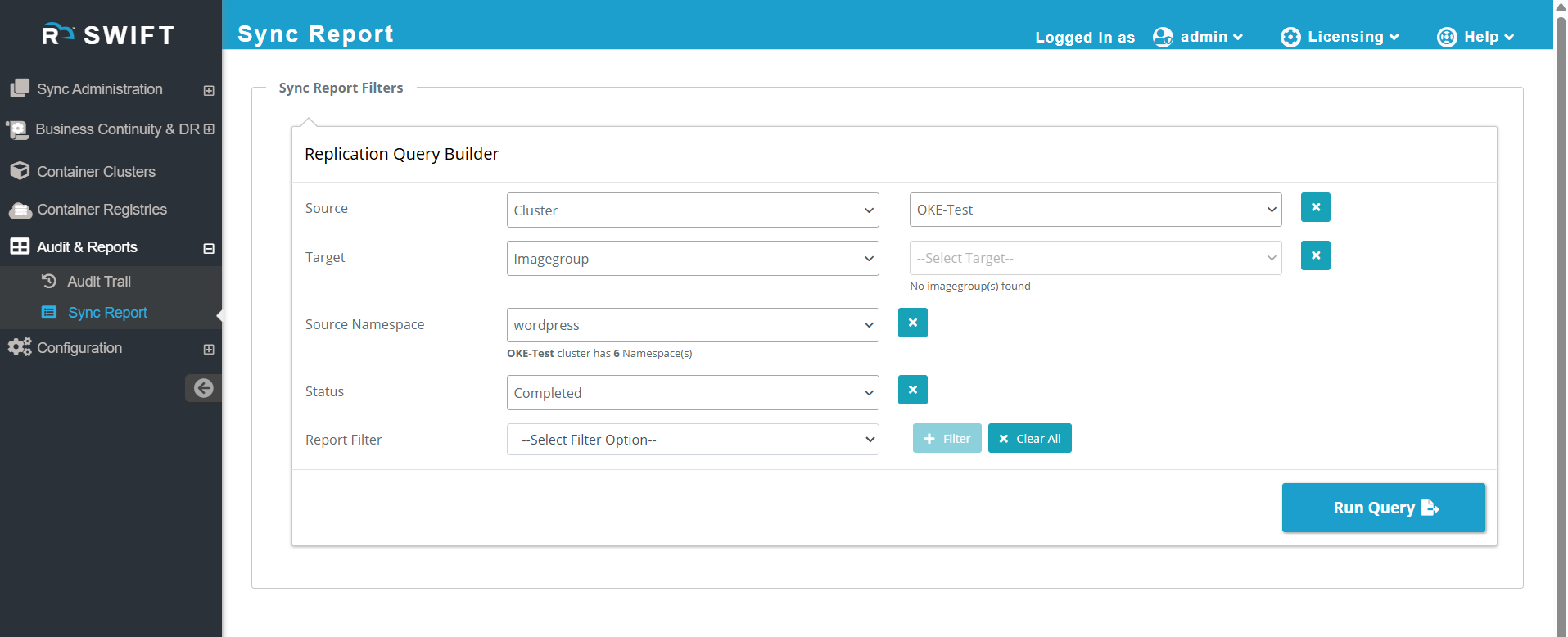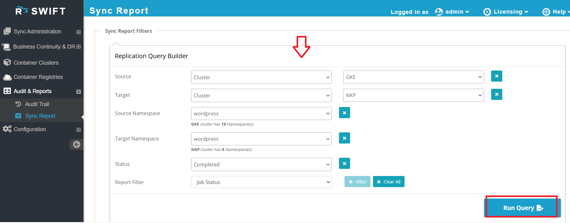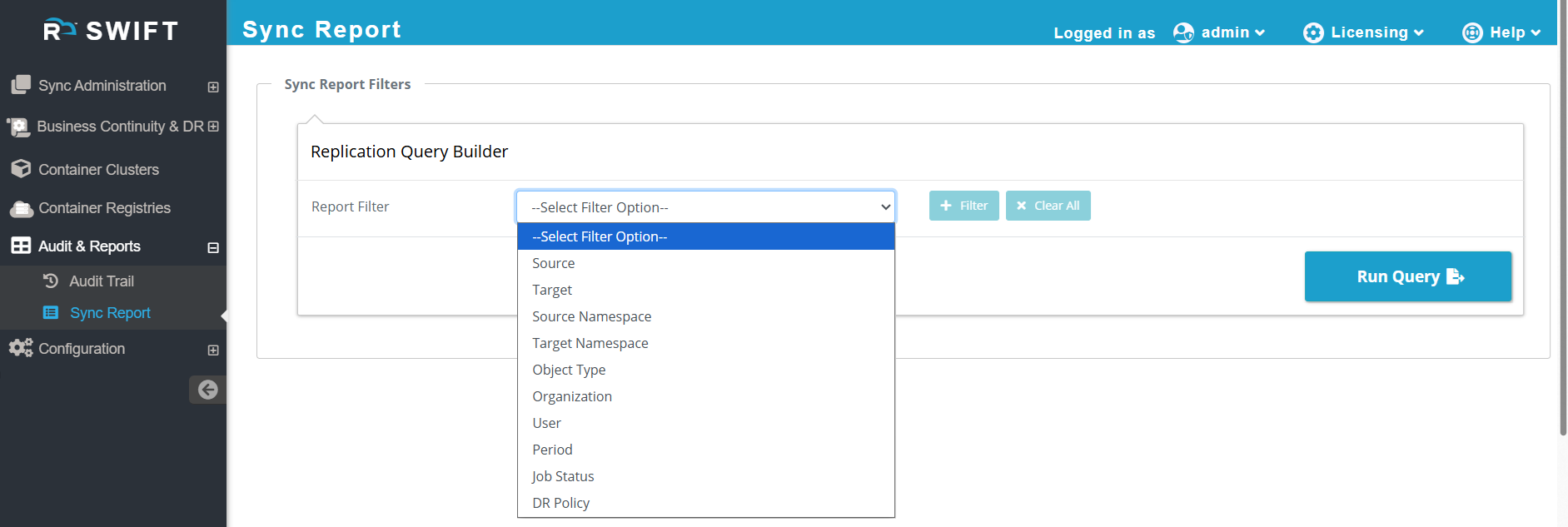 3. Apply filters such as Source, Target, Namespace, Object Type, Organization, User, Period, Job Status, or DR Policy. Build custom replication queries using the Replication Query Builder Execute the query by clicking Run Query to view sync details and status .