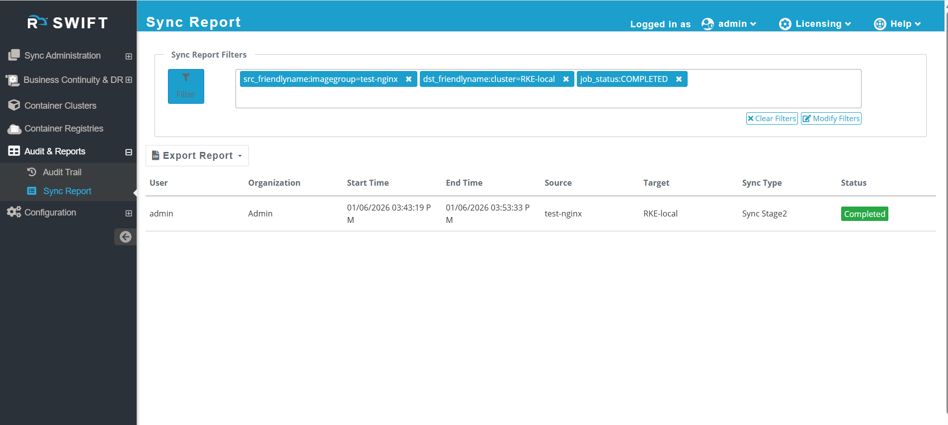 The Sync Report shows a history of all migration and DR syncs performed in SWIFT. It helps you quickly see where the sync ran from and to, who triggered it, how long it took, and whether it completed successfully. This makes it easy to verify sync results and troubleshoot if something goes wrong.