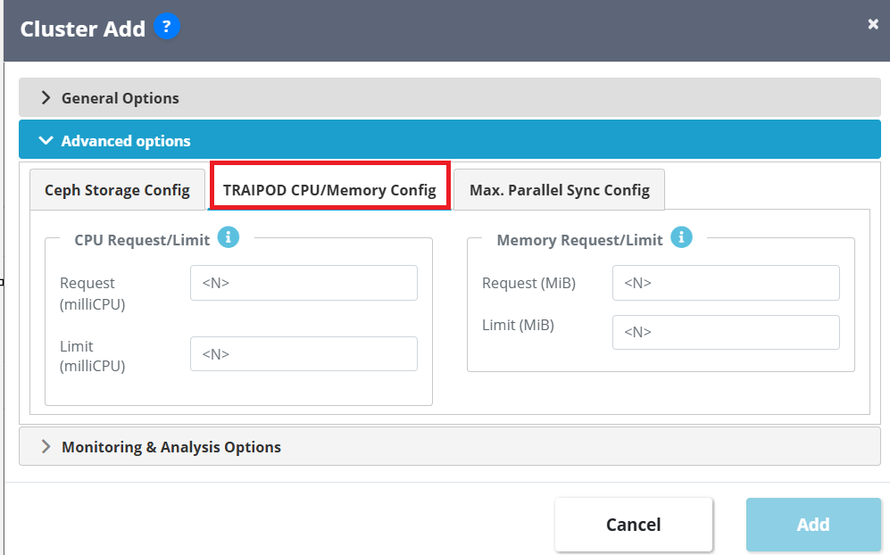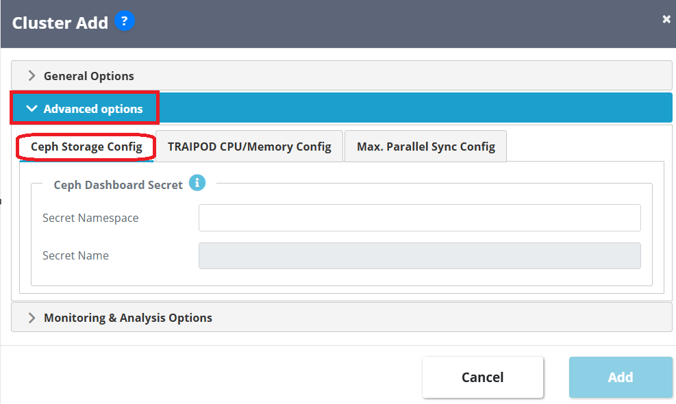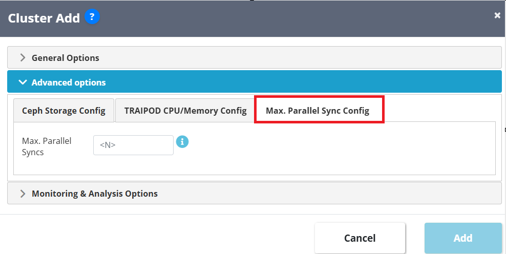 2. The Advanced Options section contains three tabs: Ceph Storage Config, TRAIPOD CPU/Memory Config, and Max Parallel Sync Config. These options let you adjust storage settings, TRAIPOD resource usage, and parallel sync limits if needed.