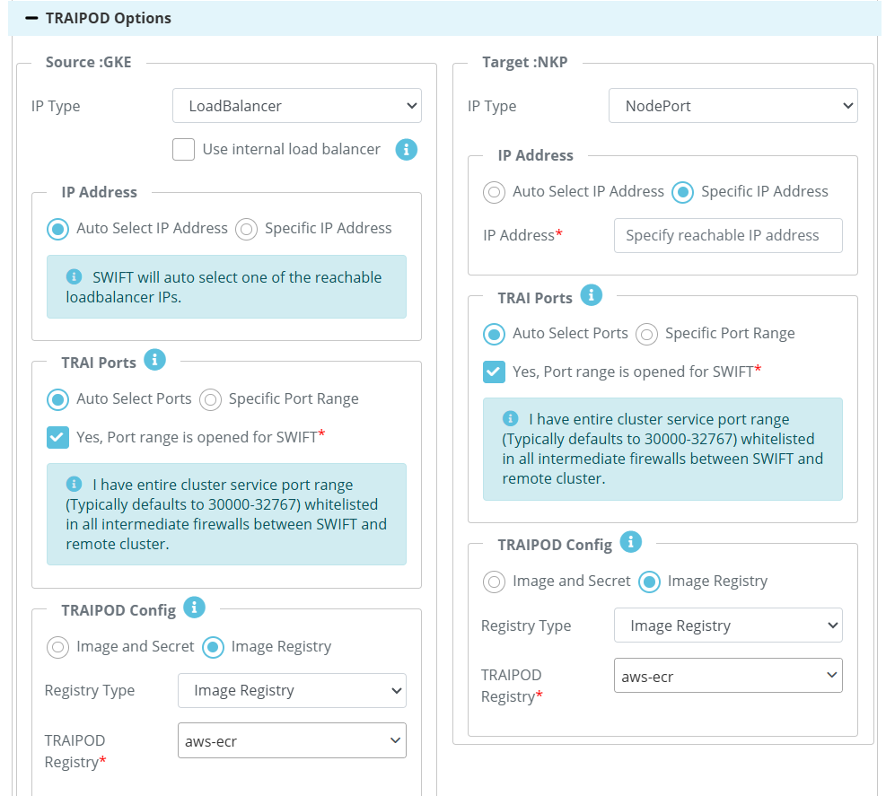 | TRAIPOD Option | In the TRAIPDO section, you can choose either Auto-select Port or specify a Custom Port Range (if you have whitelisted ports between 30000–32767). The selected port will be opened in the cloud firewall accordingly. In the TRAIPOD Config section, you will see two available options: