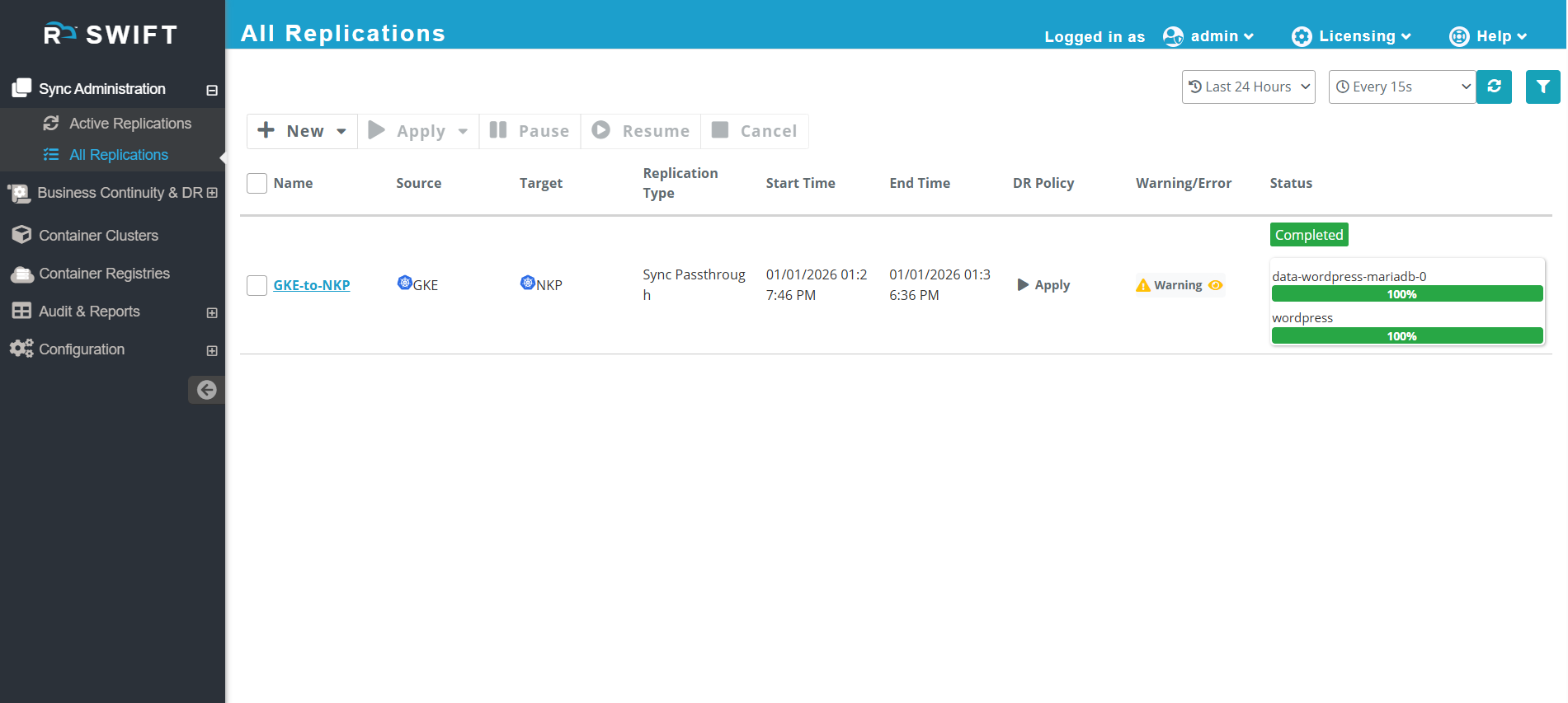 SWIFT supports sync between Kubernetes clusters, Kubernetes to OpenShift, OpenShift to OpenShift, and OpenShift to Kubernetes, enabling cross-cloud as well as cross-platform/version compatibility. All kinds of migration are supported in SWIFT. It provides a consistent application state and configurations during migration.