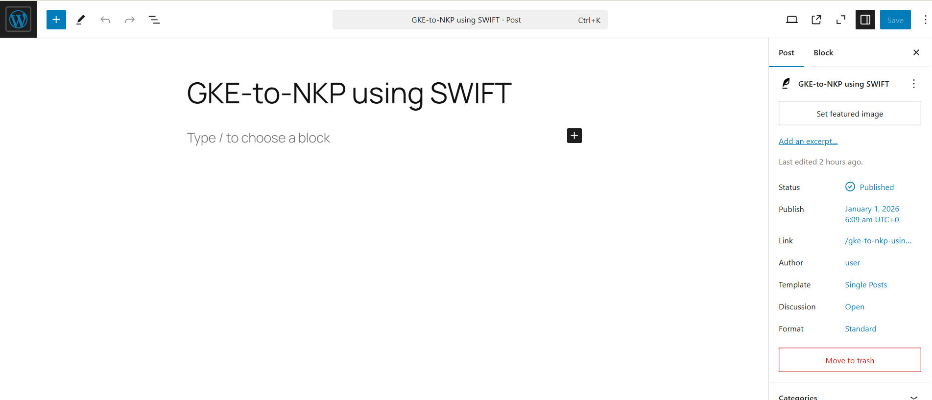 7. You can verify the migration by checking the namespace in the target cluster. You can access application from target cluster and verify that the WordPress post created on the source cluster is visible on the target NKP cluster, confirming that the application has been successfully migrated and is accessible on NKP.