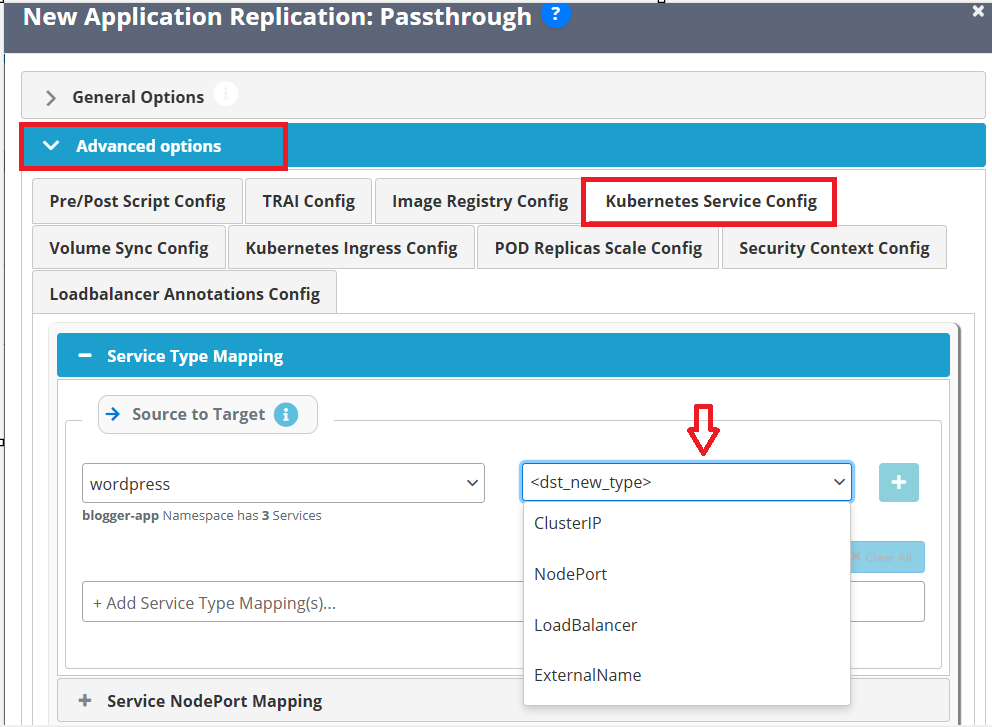 Go to Advanced Options. > Open Kubernetes Service Type Config > Change the service type to NodePort or ClusterIP as needed.