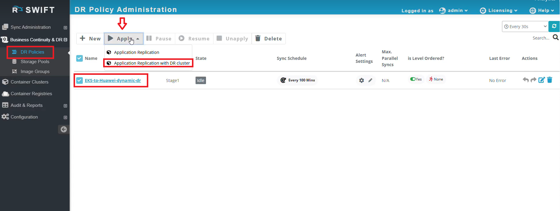 2. After creating the Stage1 DR Policy, you can select it and choose Apply, then proceed with Application Replication using the DR cluster.