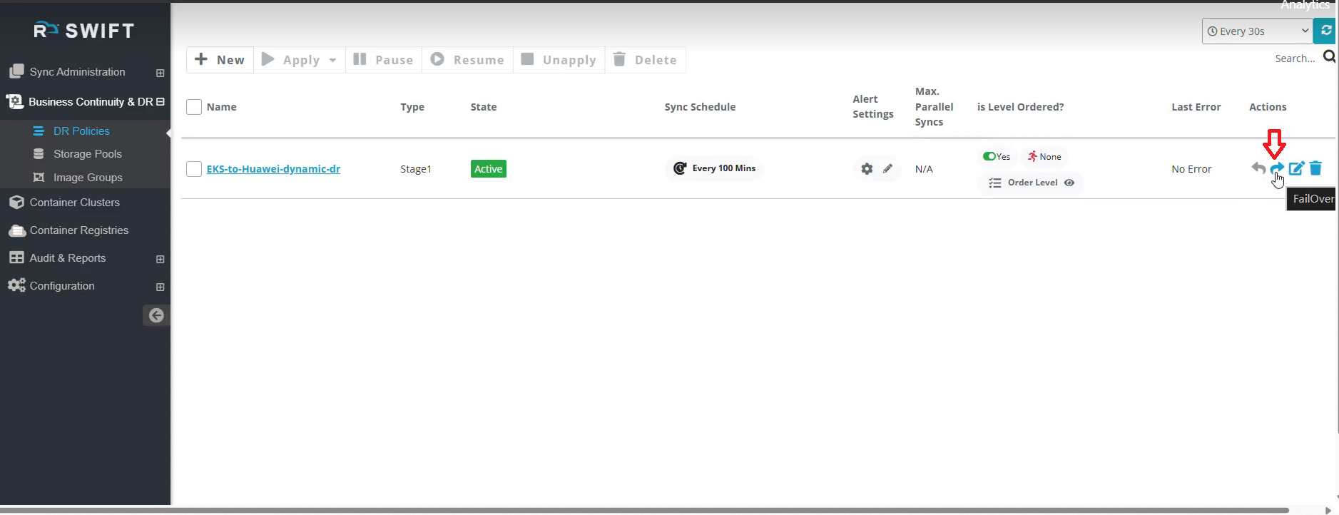 5. Click the Failover option (right-tilted arrow) to provision a dynamic DR cluster.