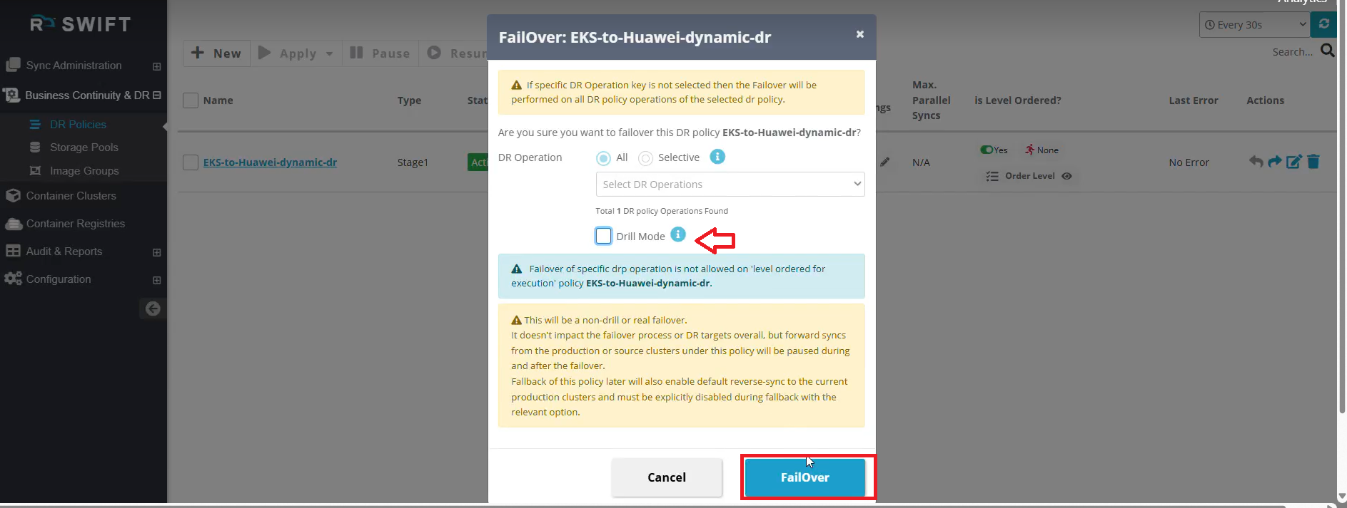 6. Make sure DR Drill is unchecked, and then click the Failover button to perform an actual failover.