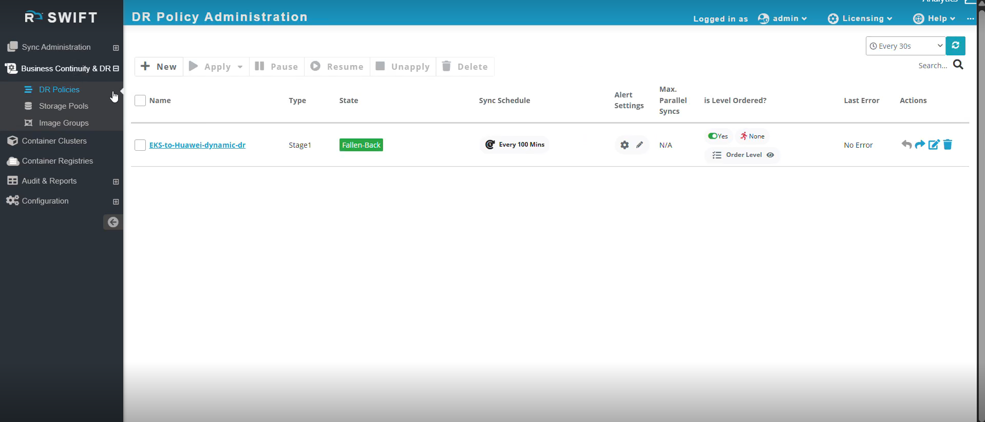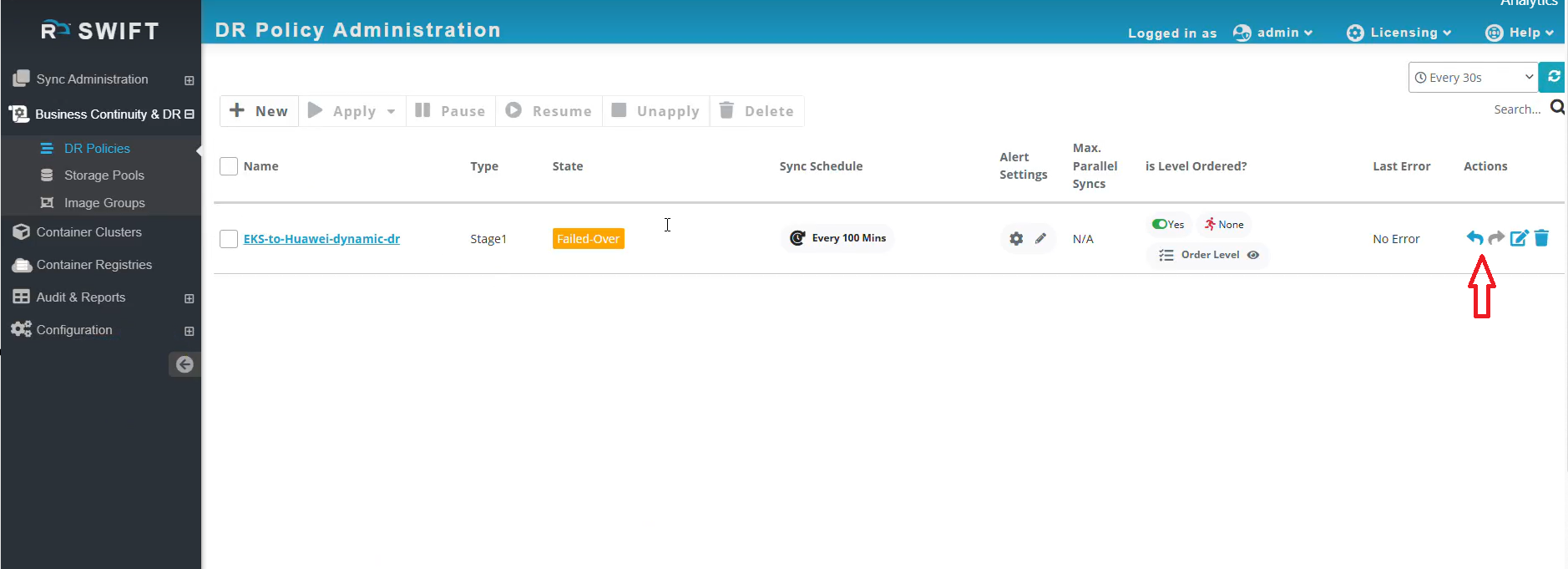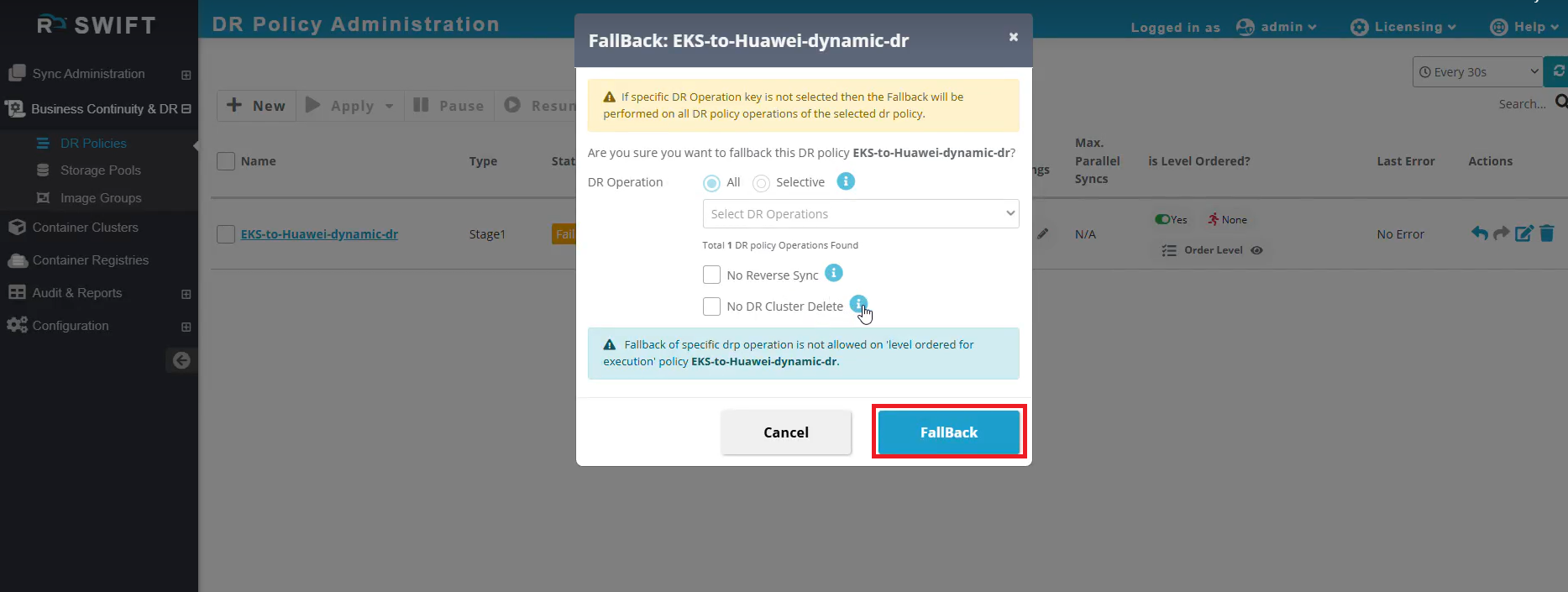 1. Navigate to DR Policies and click the left-tilted arrow to initiate the fallback.